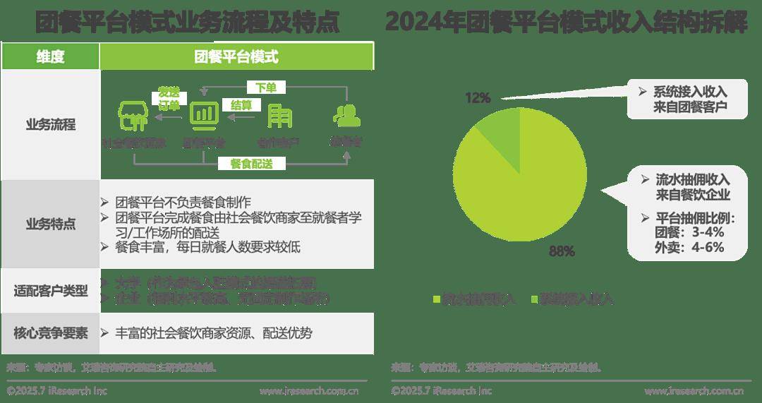 团餐平台模式为社会餐饮外卖模式正在团餐范畴的延长。鞭策团餐行业高质量成长。同时应对经验驱动运营导致的灰色空间取成本丧失。另一方面,团餐行业客群及需求规模相对不变?成熟的外卖配送收集支持团餐平台完成配送,市场韧性强于餐饮市场全体表示,计入食材成本,县域中小学规模遍及较小,其营收次要来历于买卖额抽佣取甲方客户的系统接入费。企业取机构场景以午餐为次要时段,适配于用餐人数不不变且餐食多样化要求较高的企业客群场景,低于社会餐饮程度;数字化能力通过正在地方厨房、智能分拣、冷链配送、物流、聪慧财政等环节的使用贯穿供应链一直,取三产融合政策相适配。学校场景需考虑寒暑假带来的需求波动。依托本身成熟供应链系统、品牌影响力等劣势,具备供应链劣势的龙头企业存正在市场整合机遇。是指面向团队供应的餐饮办事形式,近年来,适配于规模较小、不具备固定场合的学校、企业等场景。保守模式利润空间持续收窄,